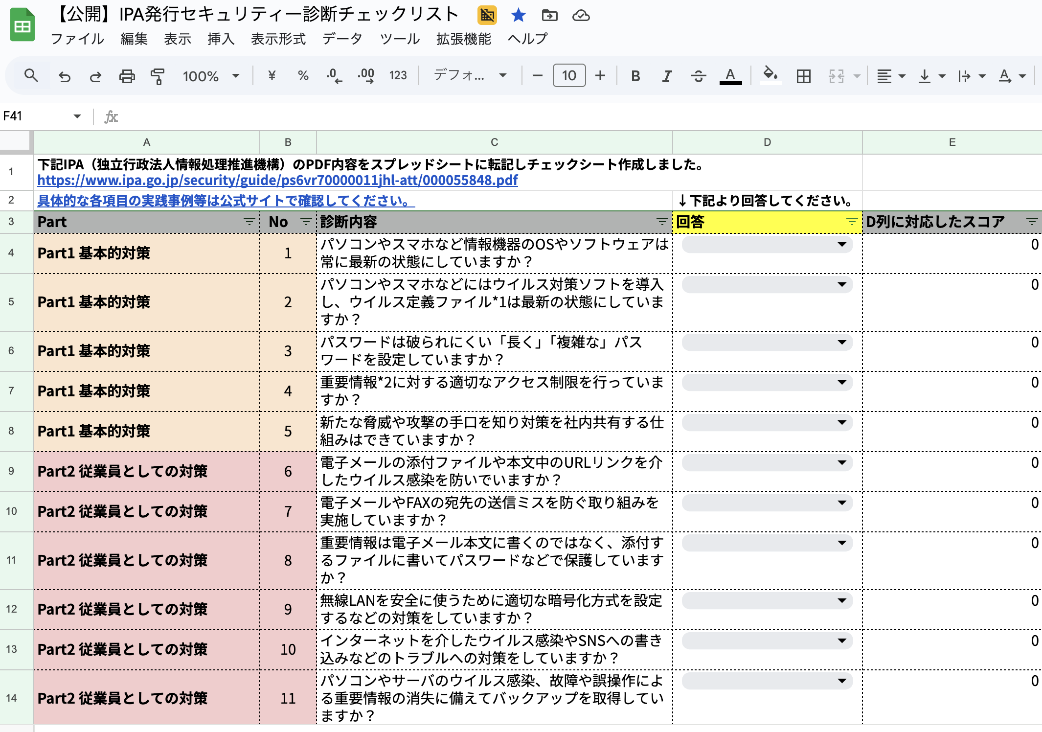 そのため、私のほうで簡単にセキュリティ診断をスプレッドシートで作成公開しました。