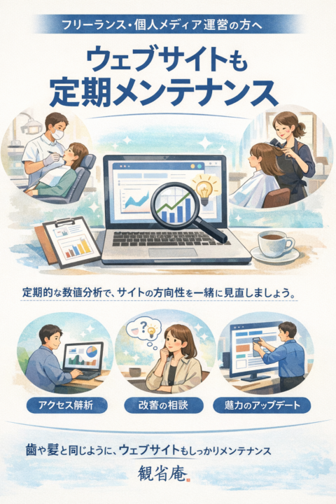 ・歯医者では「歯」を、美容院では「髪」をメンテナンスするように、観省庵では「ウェブサイト」を定期的に見直してより魅力な提案をさせていただきます