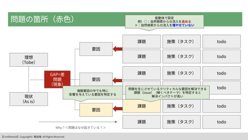 問題とは「現状と理想の差分(ギャップ)」を指す。下記添付画像の赤色でGAPと書いてある箇所です。