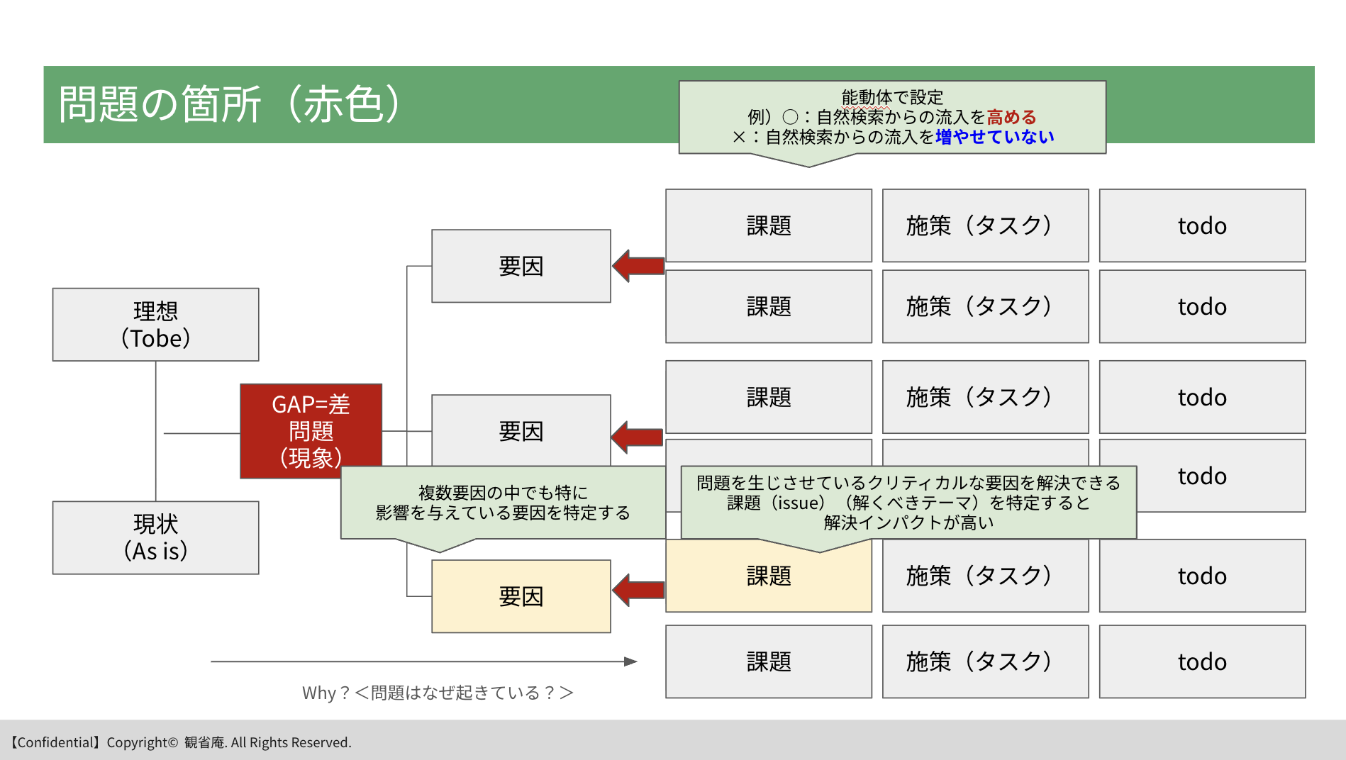 問題の要因をあぶり出すには、経験値が必要ですが、基本的にはなぜ?(Why)を繰り返すことで真因まで辿り着きます。これも闇雲にやるのではなく確度の高い仮説(仮の答え)があると効率化されます。