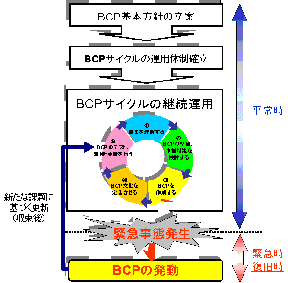 BCP(事業継続計画)とは、企業が自然災害、大火災、テロ攻撃などの緊急事態に遭遇した場合において、事業資産の損害を最小限にとどめつつ、中核となる事業の継続あるいは早期復旧を可能とするために、平常時に行うべき活動や緊急時における事業継続のための方法、手段などを取り決めておく計画のこと。 中小企業庁サイトより