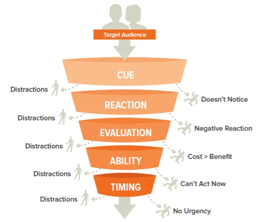 ファネルで重要なのは、どのステージにおいても、他の選択肢より効果的で良い行動だった場合にだけ次のステージに行ける、ということだ。常に他の選択肢はある。他の選択肢とは、虎視眈々と私たちを狙う他のキュー、直感的、意識的に考えている別の行動、もっと急ぎで優先度の高いことなどだ P97『行動を変えるデザイン』