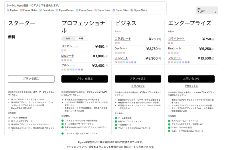 詳細は、料金ページで確認してください。https://www.figma.com/ja-jp/pricing/