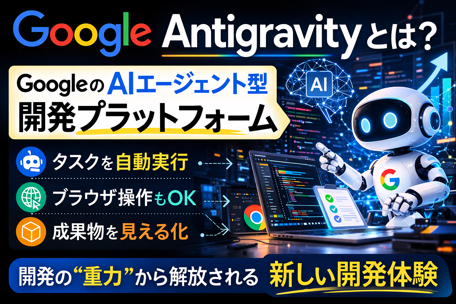 これらは、開発者を縛る開発の重力とも言えます。AntigravityはAIエージェントがこれらを代行することで開発者を重力から解放するというコンセプトです。