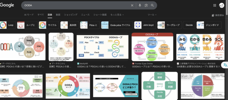 OODAで画像検索した際の図。要素がかなり省力化されています。大事なのは、フィードバック(Feedback)です。方向づけ後の、決定、行動後の情報をもとに観察に返すことです。
